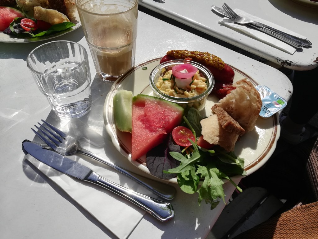 I had the meaty brunch because I wanted to try the sausage. I am rarely a fan of sausages, except in France, but I’m always curious to try it everywhere I go if it is part of the local cuisine. Call me adventurous. I didn’t like it too much. But the rest of my plate and the plates my friends ordered (vegetarian and vegan brunch) were delicious! They had great bread and butter to add to the rest. On top of that, you can help yourself with the (vegan) Nutella and other sweet spreadings. The meal accompanied with a nice latte cost me around 15€.